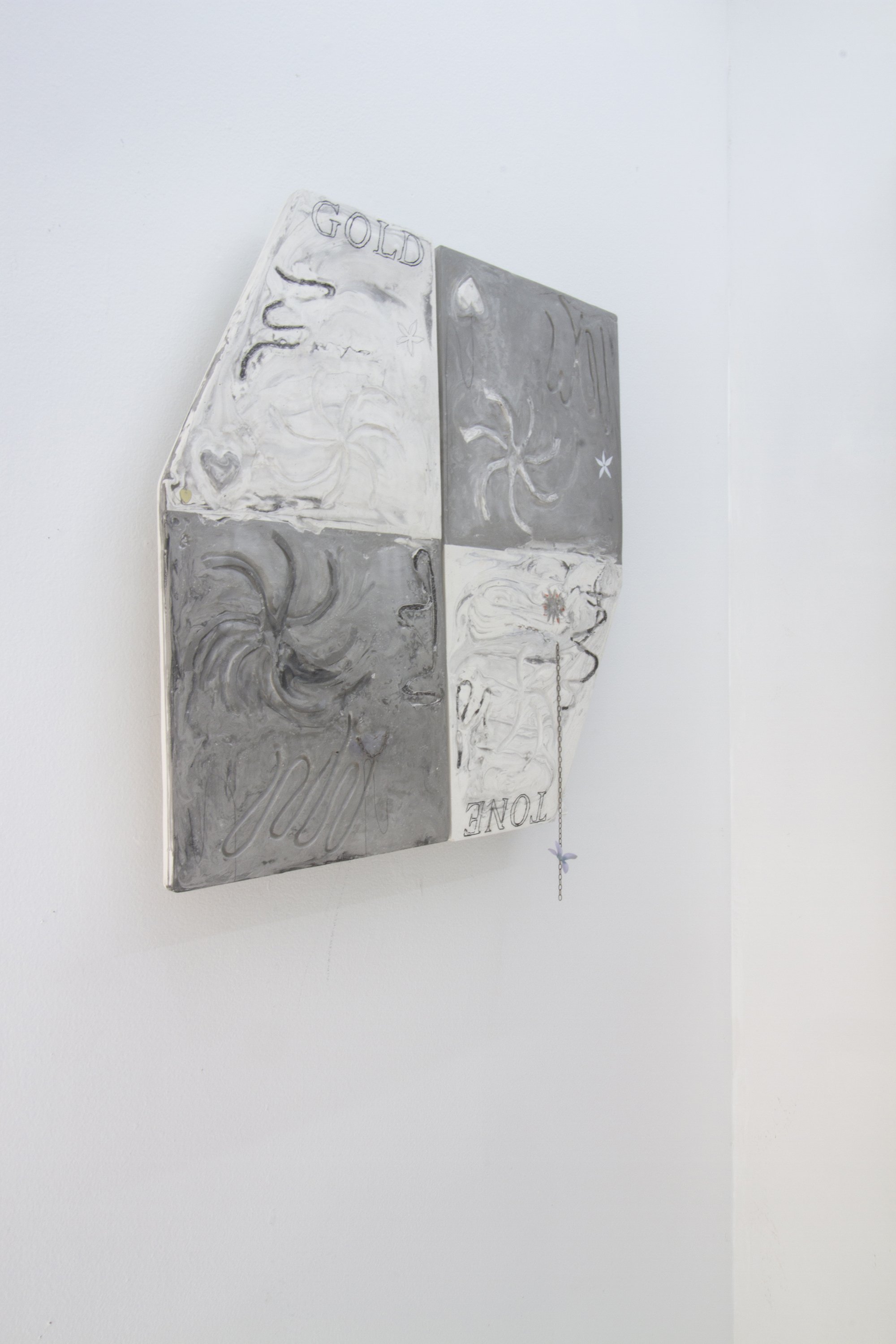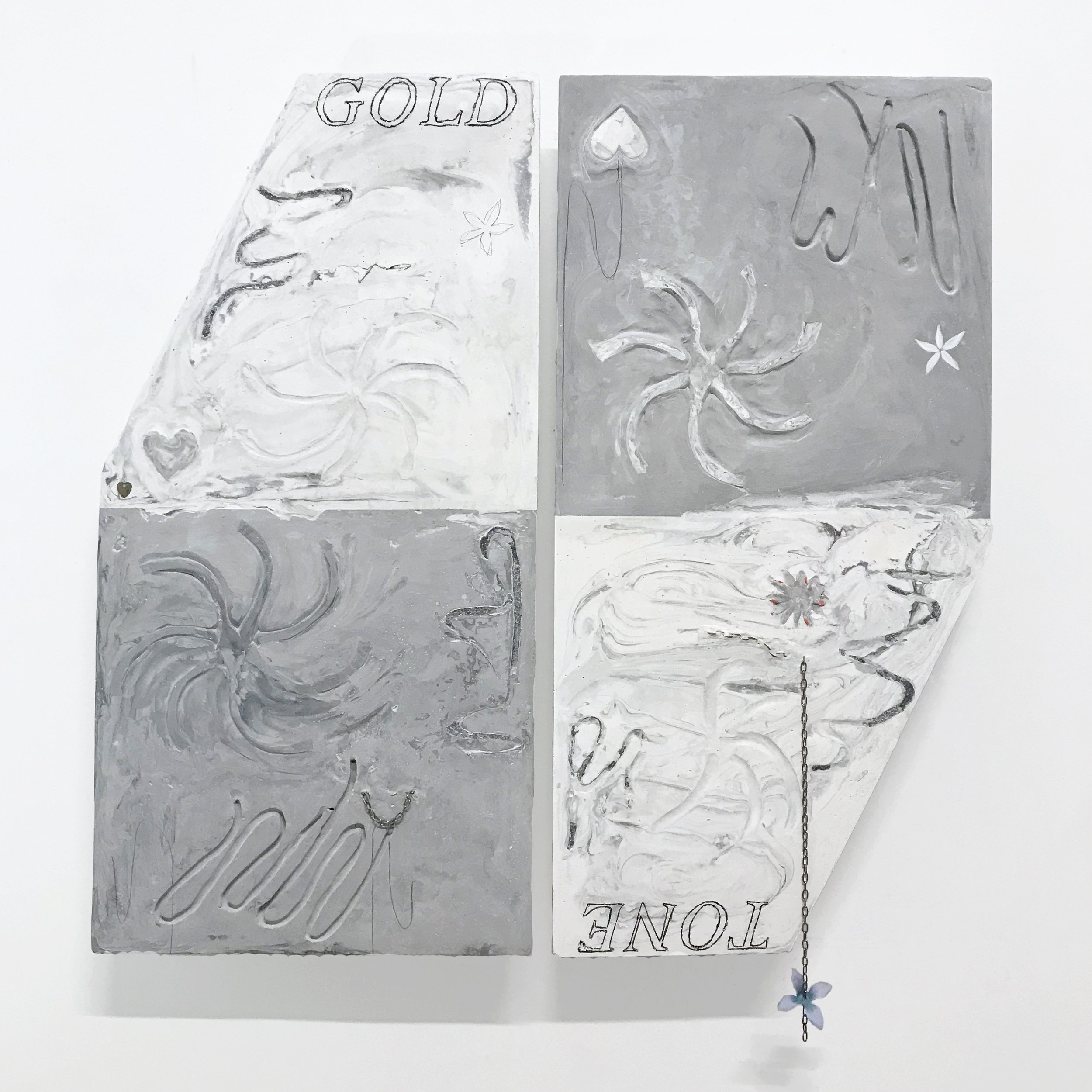Cast hydrocal, metal chain, fabric flowers, graphite, and crayon transfer